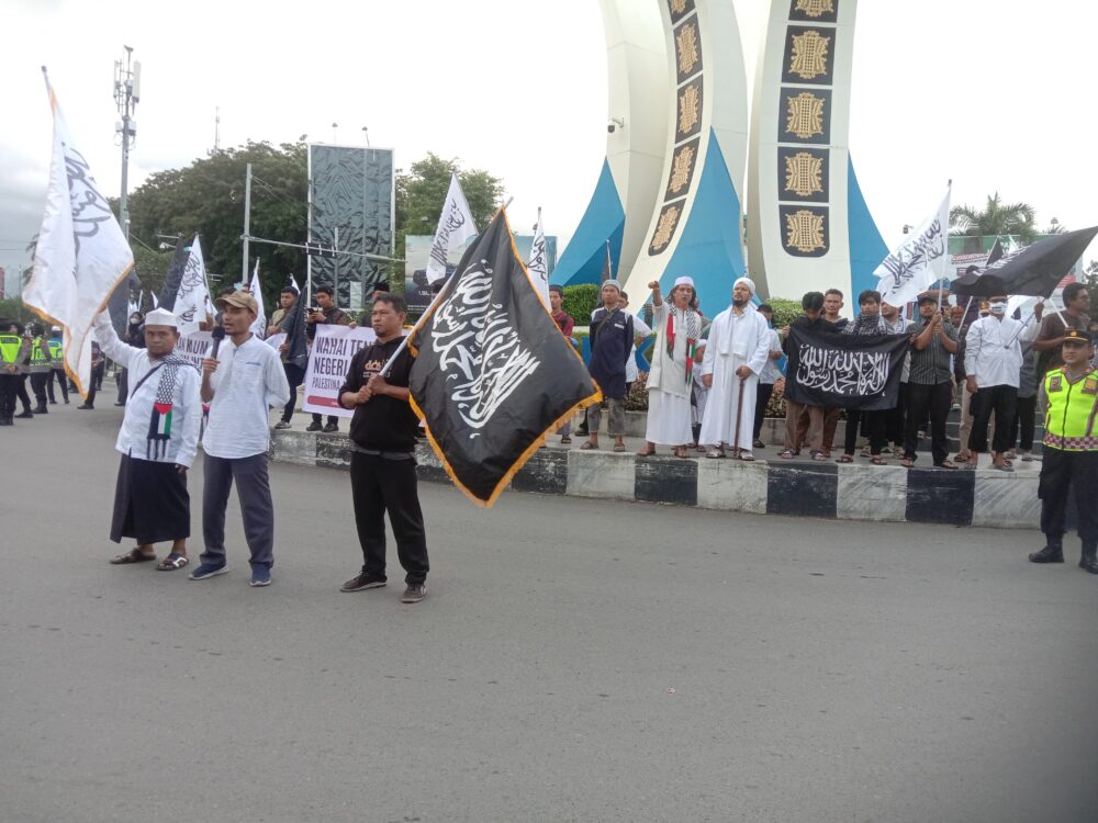 Ratusan Massa Lakukan Demo Bela Palestina di Simpang Lima Banda Aceh. Foto : Naszadayuna/analisaaceh.com