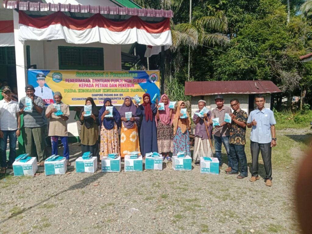 Analisaaceh.com, Blangpidie | Petani Padang Bak Jok Kecamatan Tangan-tangan, Kabupaten Aceh Barat Daya (Abdya) menerima pupuk gratis jenis NPK Mutiara 16-16-16 non subsidi bersumber dari anggaran Dana Desa (DD) program ketahanan pangan tahun 2024.
