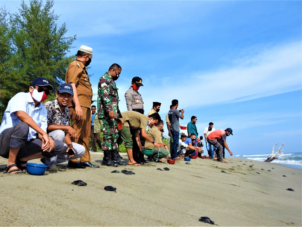 Pelepasliaran tukik penyu tersebut terlihat berbeda, seluruh pengunjung dan tamu undangan diarahkan sesuai arahan protokol kesehatan penanggulangan Covid-19 Aceh Selatan seperti mengenakan masker, melakukan pengukuran suhu tubuh, mencuci tangan.