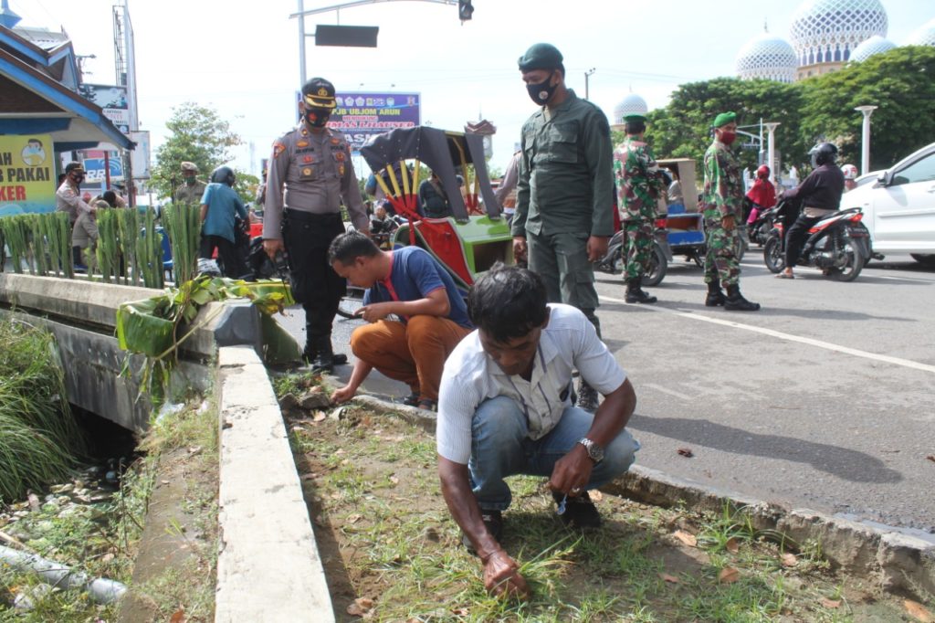 Pengguna jalan di Kota Lhokseumawe diberikan hukuman cabut rumput karena tidak mengindahkan Perwal Protokol Kesehatan berupa penggunaan masker di Taman Riyadhah, Kota Lhokseumawe, Senin pagi (14/9/20)