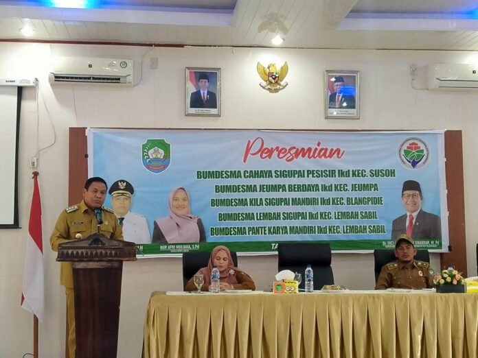 Analisaaceh.com, Blangpidie | Lima Badan Usaha Milik Desa Bersama (BUMDesma) dari sembilan Kecamatan dalam Kabupaten Aceh Barat Daya (Abdya) diresmikan oleh Pj Bupati, H. Darmansah, Senin (26/12/202).