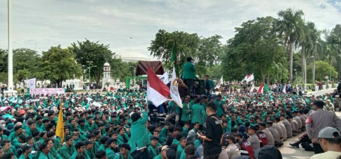 Analisaaceh.com, Banda Aceh | Ribuan mahasiswa Universitas Syiah Kuala (USK) melakukan aksi unjuk rasa menolak kenaikan Bahan Bakar Minyak (BBM) di depan kantor Gubernur pada Selasa (6/9/2022) siang.