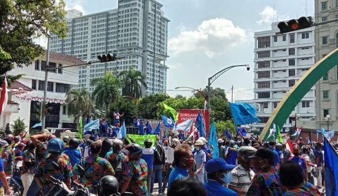 Ribuan massa tersebut menuntut dan menolak keras Rancangan Undang-undang (RUU) Omnibus Law klaster Ketenagakerjaan. Akibatnya, jalan di sekitar lokasi aksi di blokade.