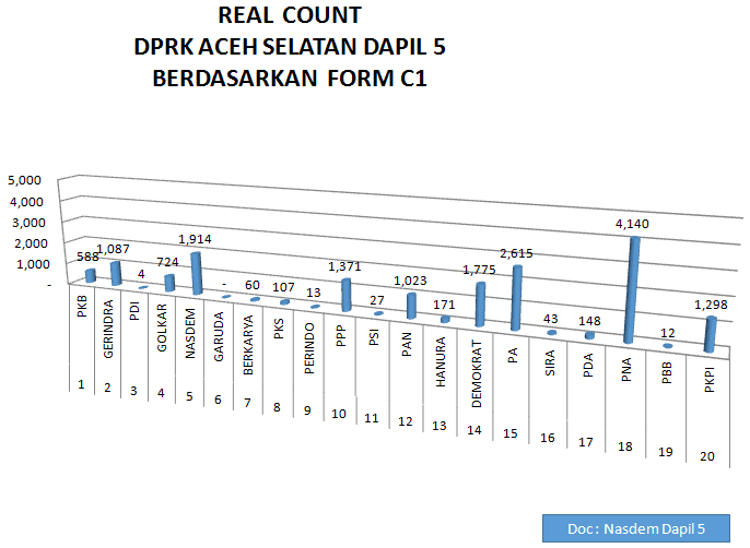 Berdasarkan data tersebut suara sah di dapil V mencapai 17.120. Namun data tersebut hanya menjadi pembanding sedangkan pengumuman resmi akan dikeluarkan oleh KIP setelah melakukan pleno ditingkat Kecamatan. (*)