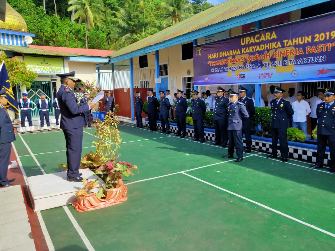 Kepala Rutan Kelas II B Tapaktuan, Fathorossi, A.md. IP. S. Sos. M.Si, selaku Inspektur upacara yang menbacakan amanat Menteri Hukum dan Hak Asasi Manusia Republik Indonesia, Yasonna H. Laoly, mengatakan, bahwa pada upacara memperingati hari Dharma Karyadhika tahun 2019 itu sengaja mengangkat tema ‘Transformasi Merah Kinerja Pasti’. Supaya perubahan rupa baik bentuk dan cara kerja di Kementerian Hukum dan HAM untuk merah yang pasti.