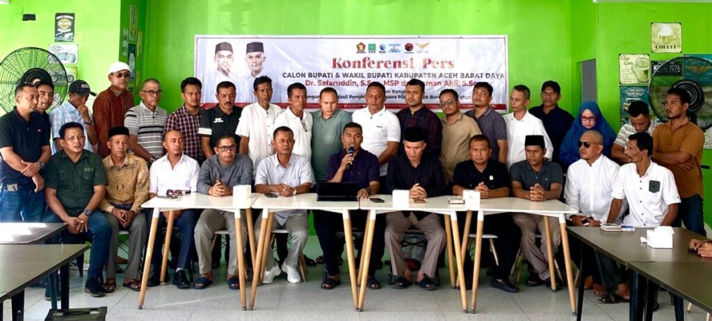 Dalam konferensi pers tersebut, Safaruddin turut didampingi Wakil Bupati terpilih, Zaman Akli, Ketua Partai Gerindra, Roni Guswandi, Ketua Partai Gelora, Salwin Saleh, ketua Partai PDA, Rizal Husaini, ketua Partai PKB, Zulkarnain dan seluruh korcam dalam kabupaten Abdya.