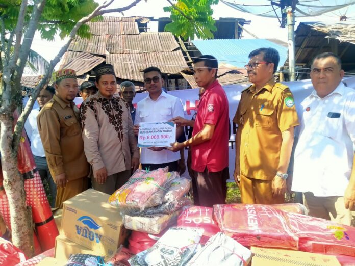 Adapun bantuan yang diberikan diantaranya baju, sarung, tikar, seng, Indomie, air mineral, minyak goreng, kayu reng dan kebutuhan pokok lainnya.