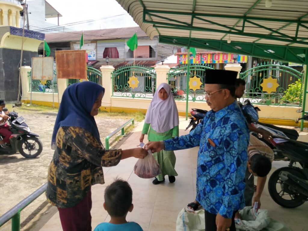 Ketua PC Muhammadiyah Blangpidie, Muslim Hasan saat menyerahkan daging untuk anak yatim. Foto: Analisaaceh.com/Ahlul Zikri
