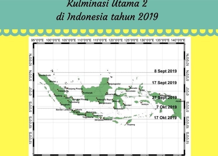 Untuk melihat lebih lanjut informasi kulminasi utama untuk bulan September-Oktober di setiap kota di Indonesia dapat dilihat dalam link BMKG berikut.