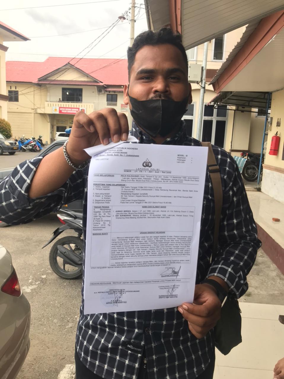 Wartawan media siber Raja Kalkausar melaporkan dugaan menghalangi tugas jurnalistik oleh oknum satpam suzuya mal ke polres lhokseumawe, Jumat (21/5/21)