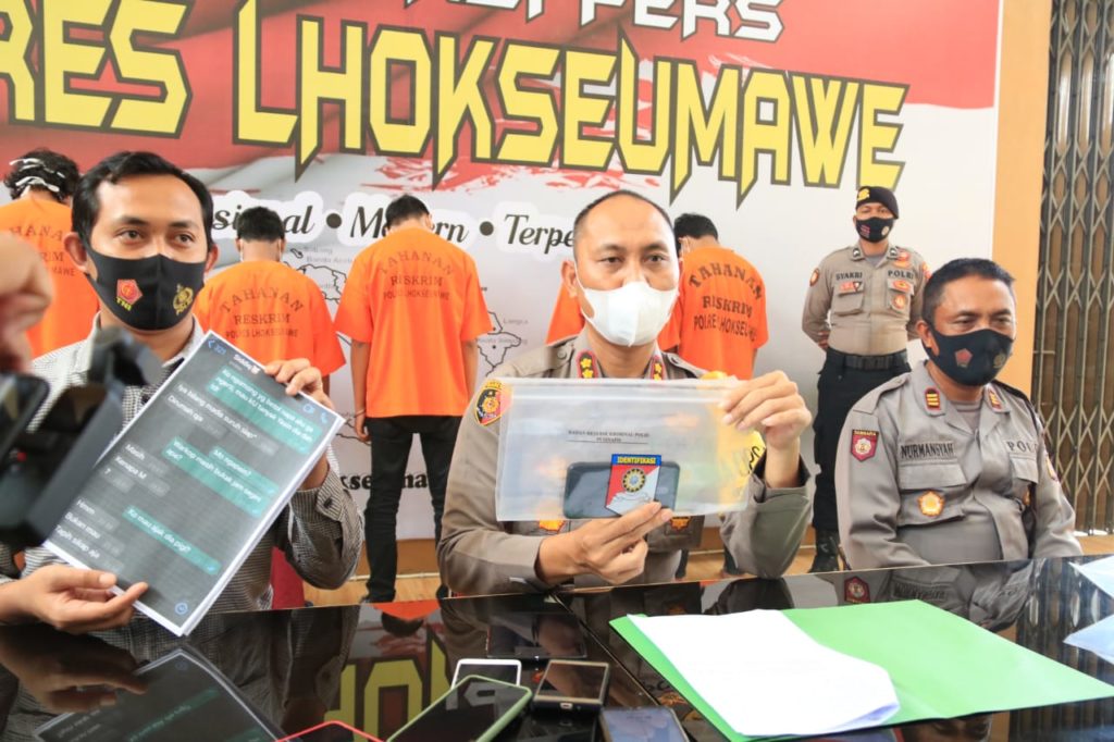 Kapolres Lhokseumawe, AKBP Eko Hartanto, SIk, MH saat konferensi pers di gedung serba guna Mapolres Lhokseumawe, Minggu (22/11/2020) mengatakan, korbannya adalah AY (18 tahun) warga Kecamatan Muara Satu, Kota Lhokseumawe yang masih berstatus mahasiswi.