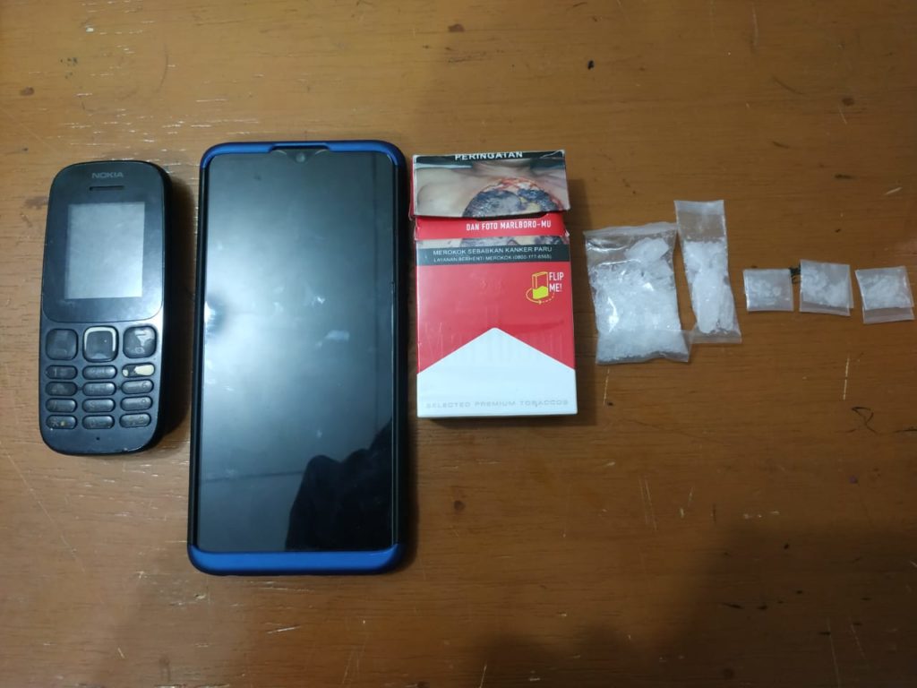 “Dalam penangkapan terhadap tersangka TA, petugas berhasil menyita barang bukti berupa bungkusan rokok Marlboro warna merah putih yang di dalamnya terdapat lima bungkusan sabu, dua unit handphone sebagai alat penghubung tersangka,” sebut Kasatresnarkoba.