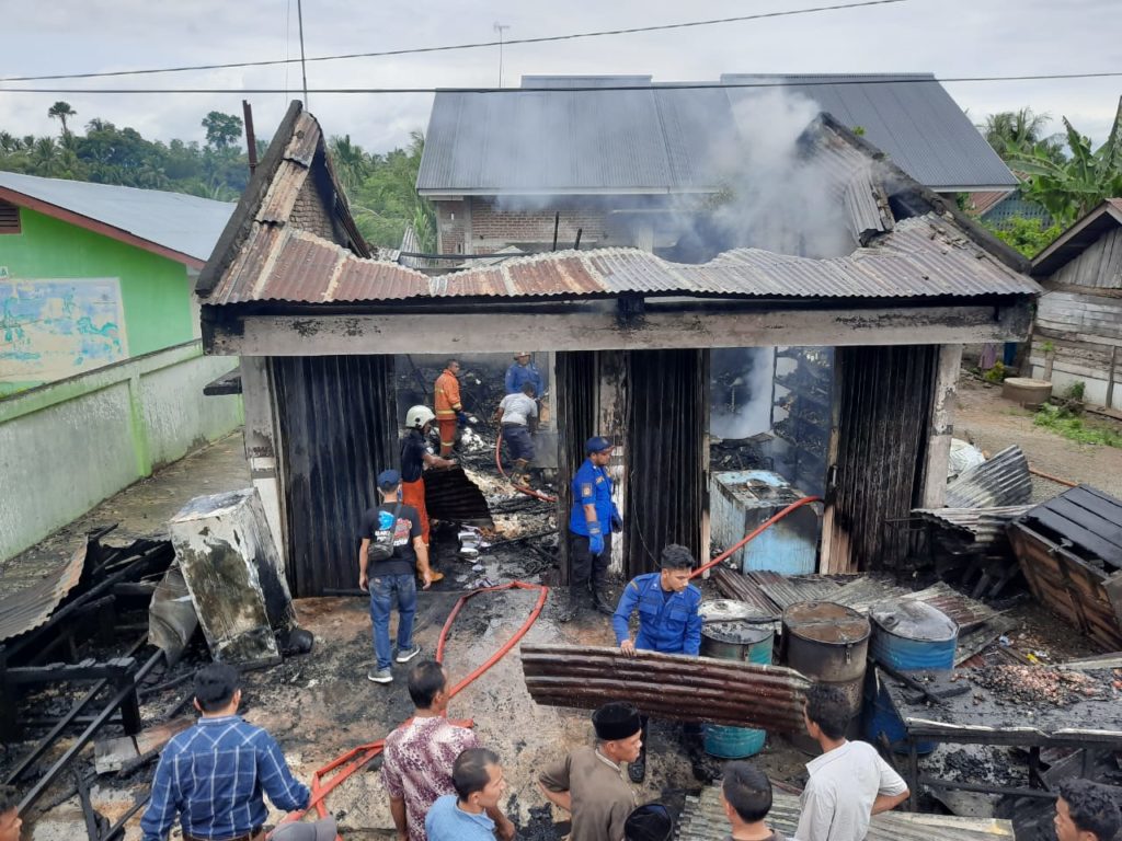 Usaha warung kopi dan dagangan kelontong milik Mukhlis (43) tersebut terbakar pada saat pelaksanaan shalat Jum’at.