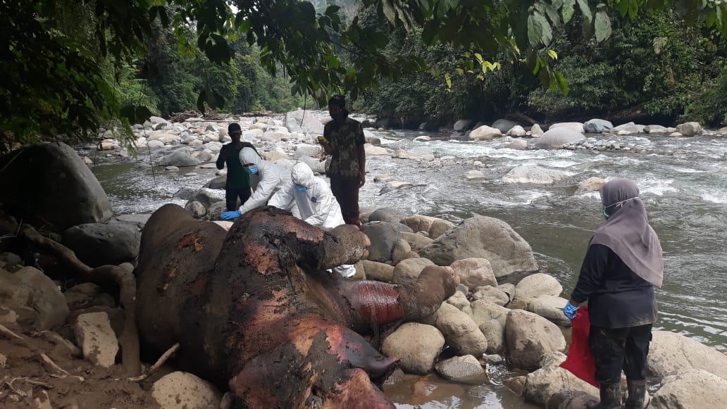 “Berdasarkan hasil nekropsi yang dilakukan secara makroskopis, dugaan sementara kematian gajah liar ini disebabkan kejadian alami (perkelahian sesama gajah jantan),” ungkapnya.