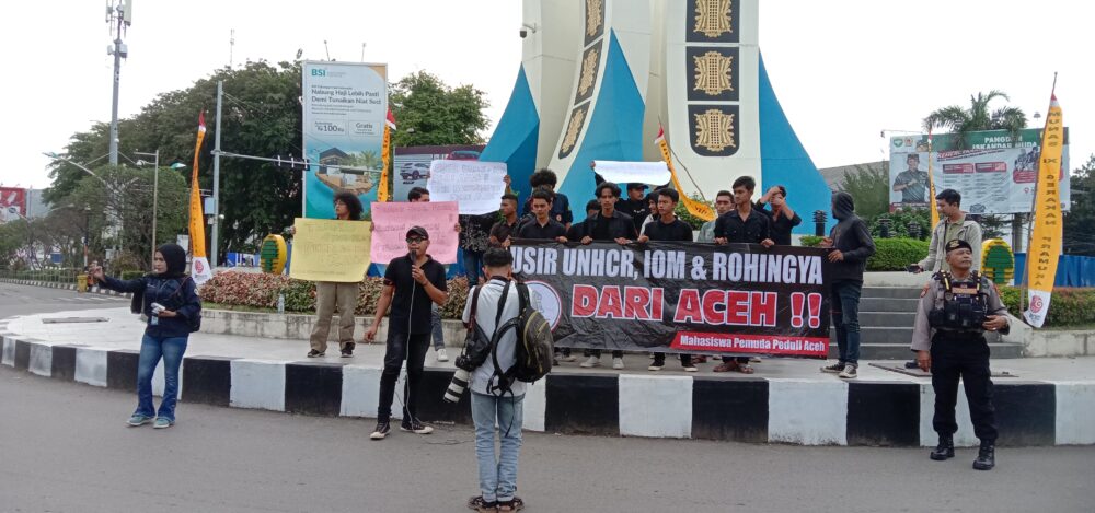 Analisaaceh.com, Banda Aceh | Sejumlah massa yang bergabung dalam Mahasiswa Pemuda Peduli Aceh melakukan aksi demo menolak kedatangan dan menetapnya Rohingya di Aceh di Tugu Simpang Lima, Kota Banda Aceh Rabu (29/11/2023) sekira pukul 16.00 WIB.