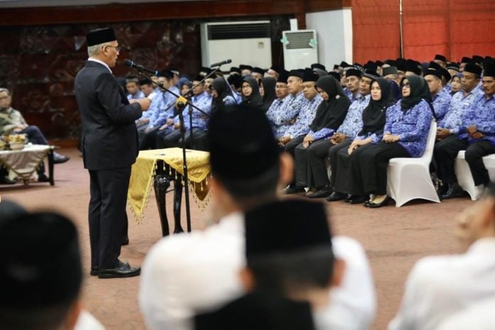 Analisaaceh.com, BANDA ACEH | Sekda Aceh dr Taqwallah, M.Kes melantik dan mengambil sumpah 433 Kepala Sekolah Lanjutan Tingkat Atas (SLTA) yang meliputi Sekolah Menengah Atas (SMA), Sekolah Menengah Kejuruan (SMK), dan Kepala Sekolah Luar Biasa (SLB), atas nama Gubernur Aceh, di Anjong Mon Mata, Banda Aceh, Jumat, 10-01-2020.