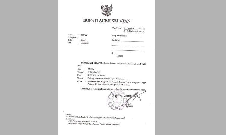 Screnshot Undangan Pelantikan Sekda Aceh Selatan