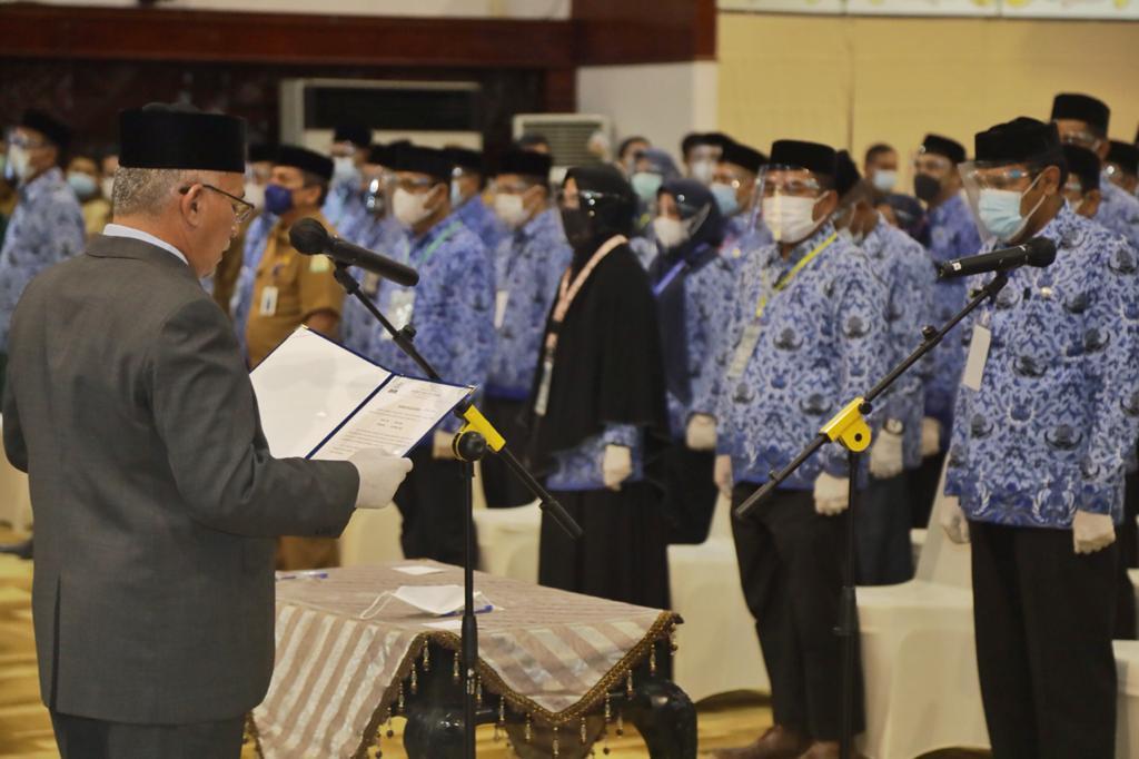 Sekretaris Daerah Aceh, dr. Taqwallah, M.Kes mengambil sumpah dan melantik pejabat Administrator (Eselon III) dan Pengawas (Eselon IV) di Lingkup Pemerintah Aceh, 6/4/2021.