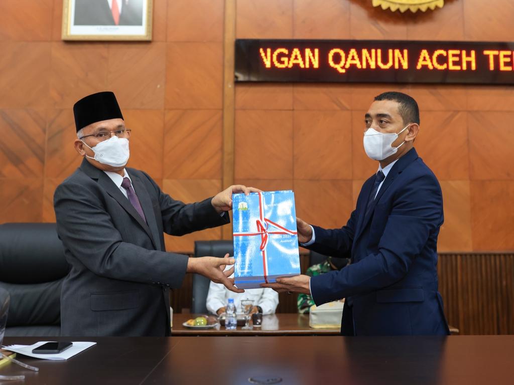 Sekretaris Daerah Aceh, dr. Taqwallah. M. Kes menerima dokumen rekomendasi dari Ketua DPR Aceh, Dahlan Jamaluddin Terhadap LKPJ Gubernur Aceh 2020 pada Rapat paripurna DPR Aceh Tahun 2021 Dalam Rangka Penyampaian Rekomendasi DPR Aceh Terhadap Laporan Keterangan Pertanggungjawaban (LKPJ) Gubernur Aceh Tahun Anggaran 2020 Gedung Utama DPRA, Banda Aceh, Senin (7/6/2021).