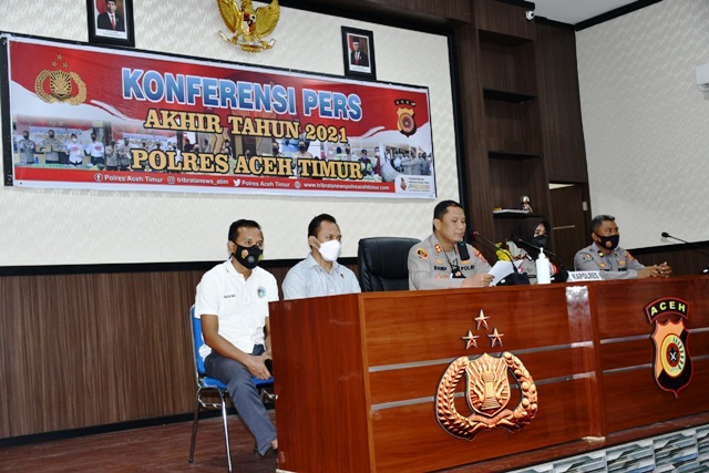 “Sementara pada tahun 2020, tindak kriminal yang terjadi sejumlah 299 kasus dengan crime clearance 285 kasus dengan persentase 95 persen,” Kapolres Aceh Timur, AKBP Mahmun Hari Sandi Sinurat dalam konferensi pers akhir tahun pada Jum’at (31/12/2021)..