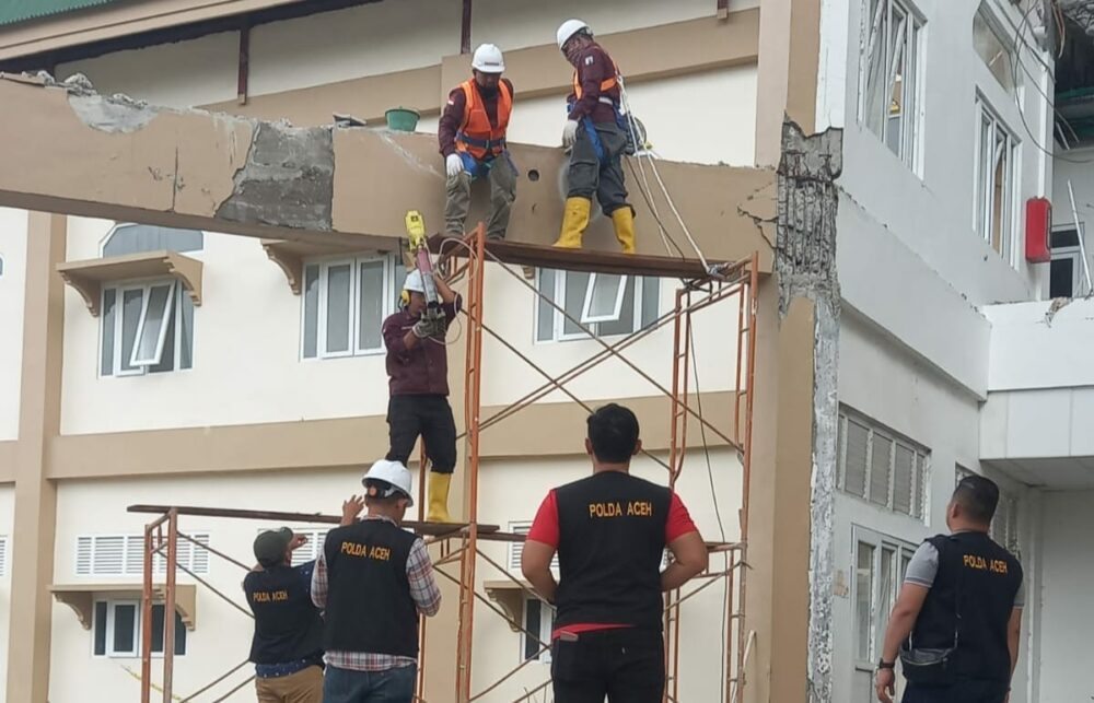 Dirreskrimsus Polda Aceh Kombes Sony Sonjaya mengatakan, turunnya beberapa ahli konstruksi ini untuk mengambil sampel besi tulangan dan melaksanakan core drill–metoda pengambilan sampel beton pada struktur bangunan.
