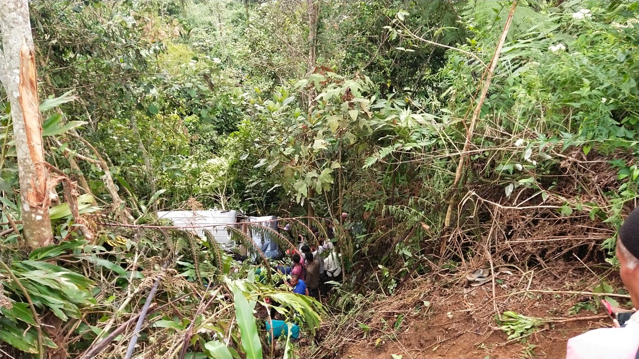 Kemudian yang bersangkutan langsung turun melihat ke arah bekas tersebut dan ditemukan satu unit mobil Toyota Kijang Komando yang jatuh ke jurang sedalam 70 meter.