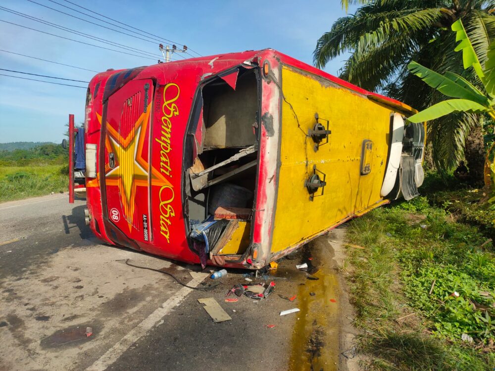 Bus Sempati Star terbalik di jalan Medan - Banda Aceh, Gampong Aramiah Kecamatan Birem Bayeun, Aceh Timur, Senin (30/05/22). Foto: Chairul/Analisaaceh.com