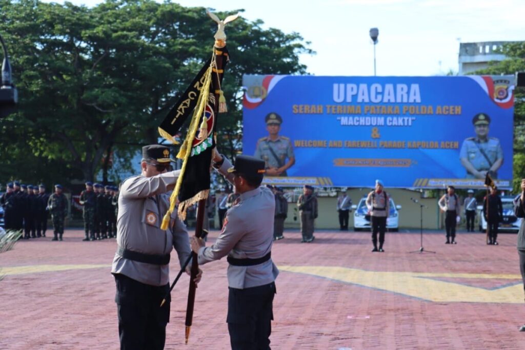 Puncak prosesi ditandai dengan upacara serah terima Pataka Polda Aceh “Machdum Sakti”, yang menjadi simbol kewenangan dan tanggung jawab dalam memimpin Polda Aceh.