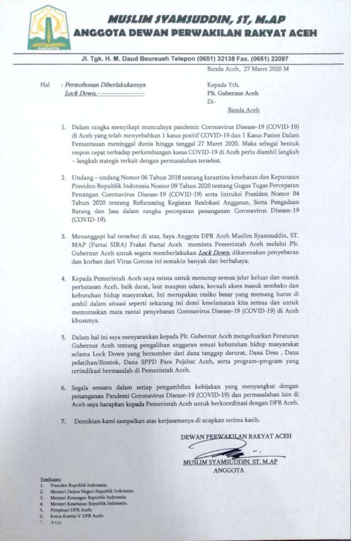 Analisaaceh.com, Banda Aceh |  Anggota DPR Aceh dari Partai Sira Muslim Syamsuddin, MAP menyiratkan keseriusannya meminta pemberlakuan lockdown di Aceh. Muslim menyurati Plt Gubernur Aceh meminta segera diterapkan penguncian wilayah dan akses ke propinsi paling barat Indonesia.
