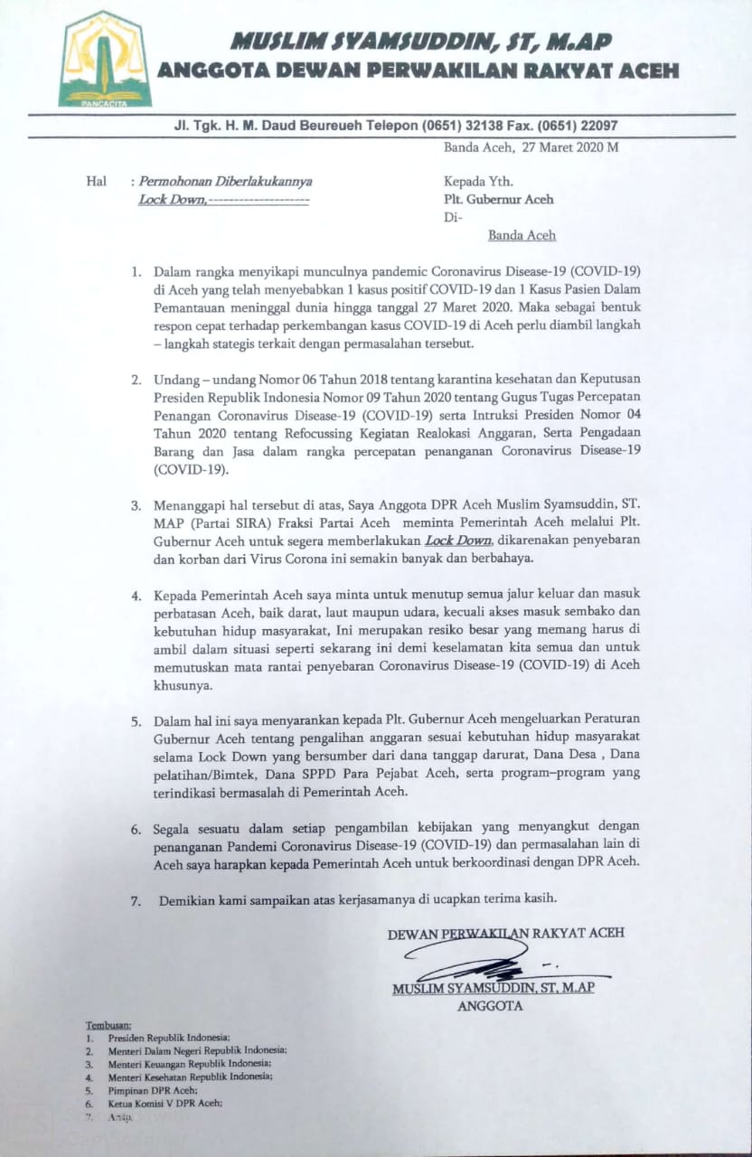 Surat tertanggal 27 Maret 2020 yang salinannya dikirim ke redaksi analisaaceh.com juga ditembuskan ke Presiden RI, Menteri Dalam Negeri, Menteri Kesehatan, Menteri Keuangan, pimpinan DPRA hingga pimpinan Komisi V.