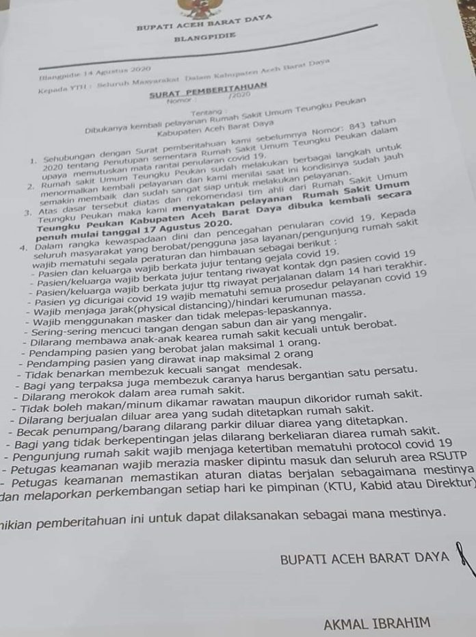 Hal tersebut sebagaimana disampaikan oleh Bupati Abdya Akmal Ibrahim, perihal dibukanya kembali pelayanan RSUTP Abdya yang diupload melalui laman Facebook miliknya pada Senin (17/8/2020).