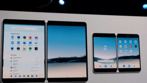 Surface Duo agak mirip dengan sistem operasi Windows 10X yang menjalankan Surface Neo, laptop dual-screen berukuran mungil yang juga dikenalkan bebarengan Surface Duo.