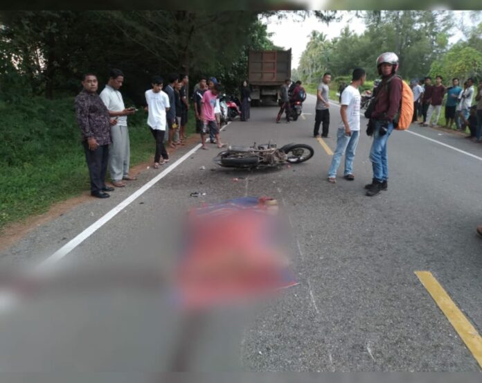 Analisaaceh.com, Tapaktuan | Seorang pengendara sepeda motor (sepmor) meninggal dunia usai menabrak dump truk Fuso di jalan Tapaktuan – Subulussalam, Rantau Sialang, Gampong Pasie Lembang, Kecamatan Kluet Selatan, Aceh Selatan, Jum’at (4/2/2022) pukul 18.00 WIB.