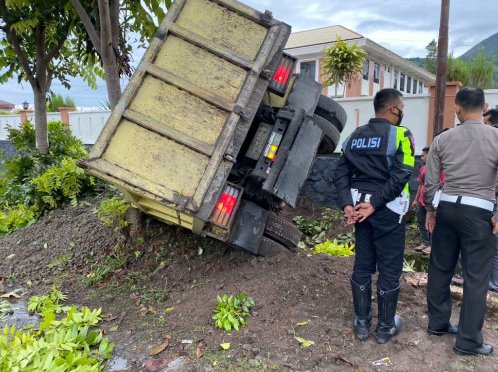 Sebuah dump truk yang terperosok ke parit usai menabrak pohon kayu di Bener Meriah, Kamis (25/11/2021).
