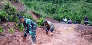 Babinsa Koramil 13/KT Kodim 0107/Asel Bersihkan Material Longsor