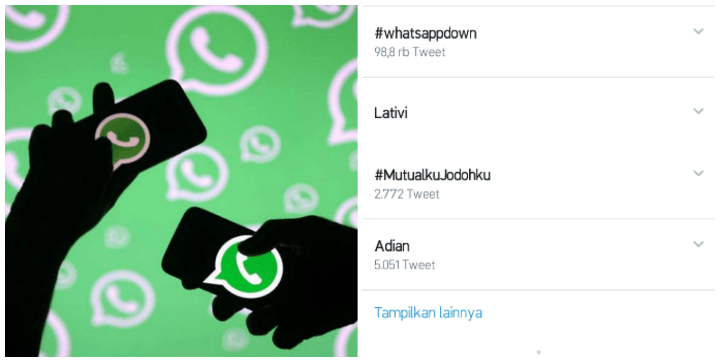Hingga berita ini ditayangkan, tagar #WhatsAppDown telah dituliskan sebanyak 98,8 ribu kali ditulis, bahkan memuncaki Trending Topic dunia selama dua jam setelah gangguan WhatsApp.