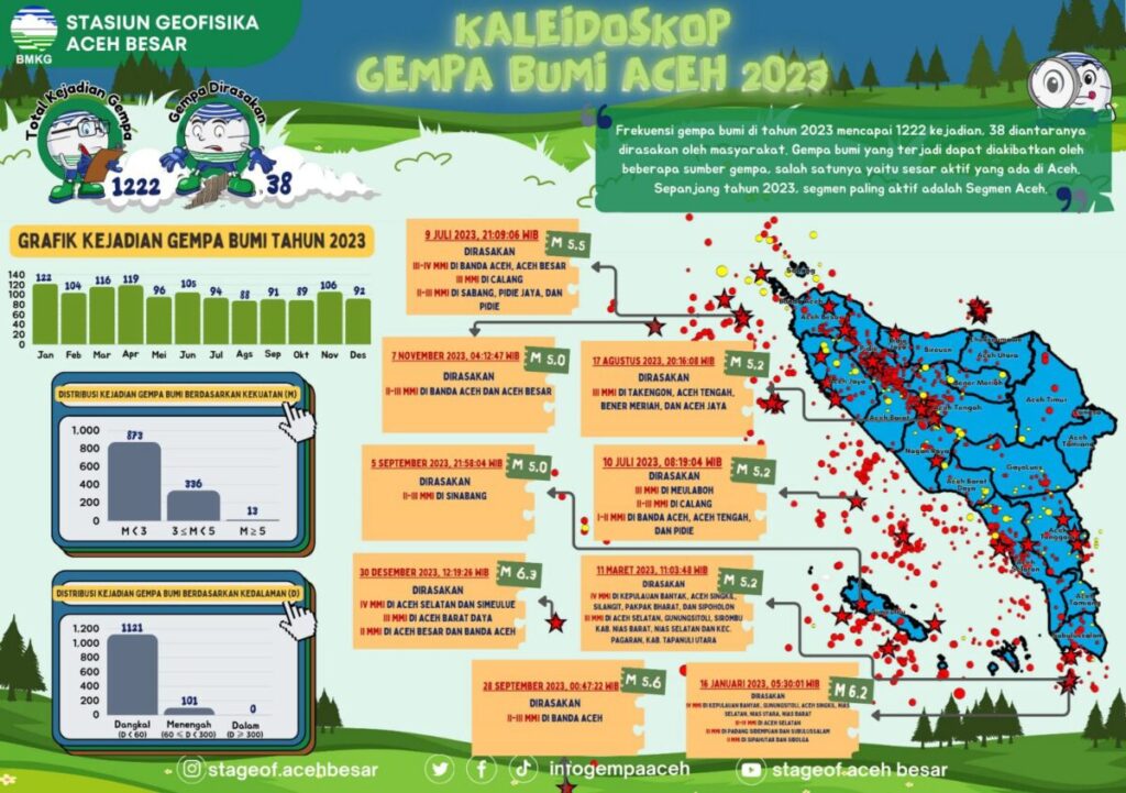 Analisaaceh.com, Banda Aceh | Badan Meteorologi Klimatologi dan Geofisika (BMKG) Aceh Besar mencatat sebanyak 1222 kejadian gempa bumi yang terjadi di tahun 2023 di wilayah Aceh dengan berbagai kekuatan (Magnitudo) dan kedalaman.