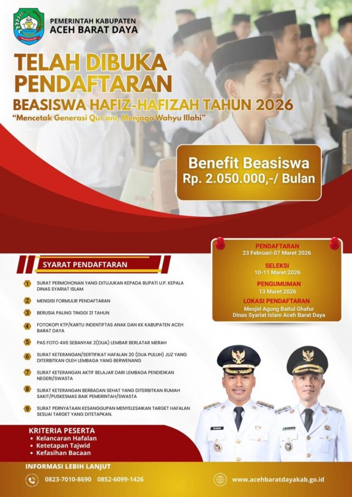 Secara terpisah, Kepala Dinas Syariat Islam (DSI) Abdya, Muhammad Rasyid membenarkan bahwa Pemkab telah membuka pendaftaran beasiswa bagi hafidz dan hafizah tahun 2026.