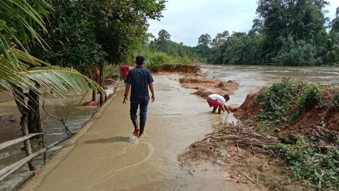 “Dari hasil pantauan di lapangan, terdapat dua titik tebing sungai yang patah dengan lebar mencapai 10 Meter, yaitu di Dusun Kuta Awe dan Dusun Pinto Kuta Desa Tanjong Awe. Sebanyak 30 rumah warga yang berdekatan dengan sungai terendam air setinggi 40 cm,” ujarnya.