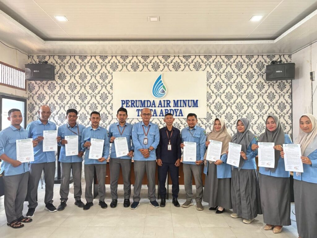 Karyawan Perumdam Tirta Abdya saat menyerahkan dokumen pakta integritas kepada Plt Direktur SM Riza Ariffiandi, Selasa (13/1/2026). Foto:Ahlul Zikri/Analisaaceh.com