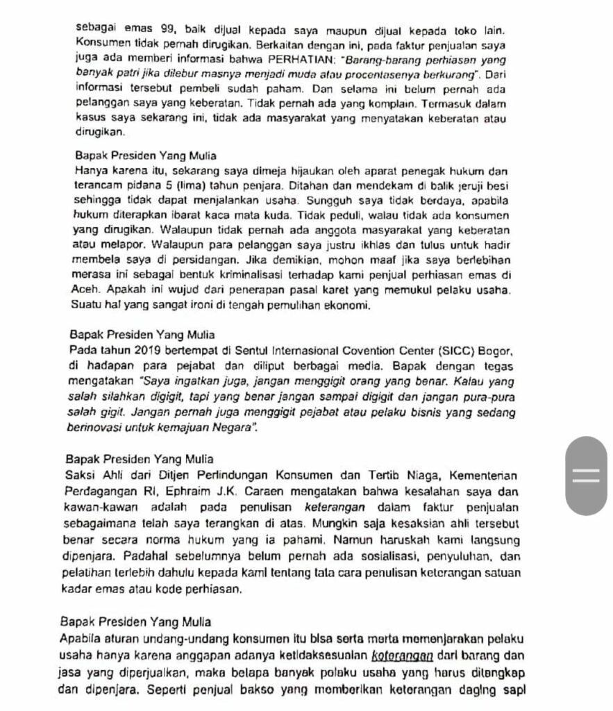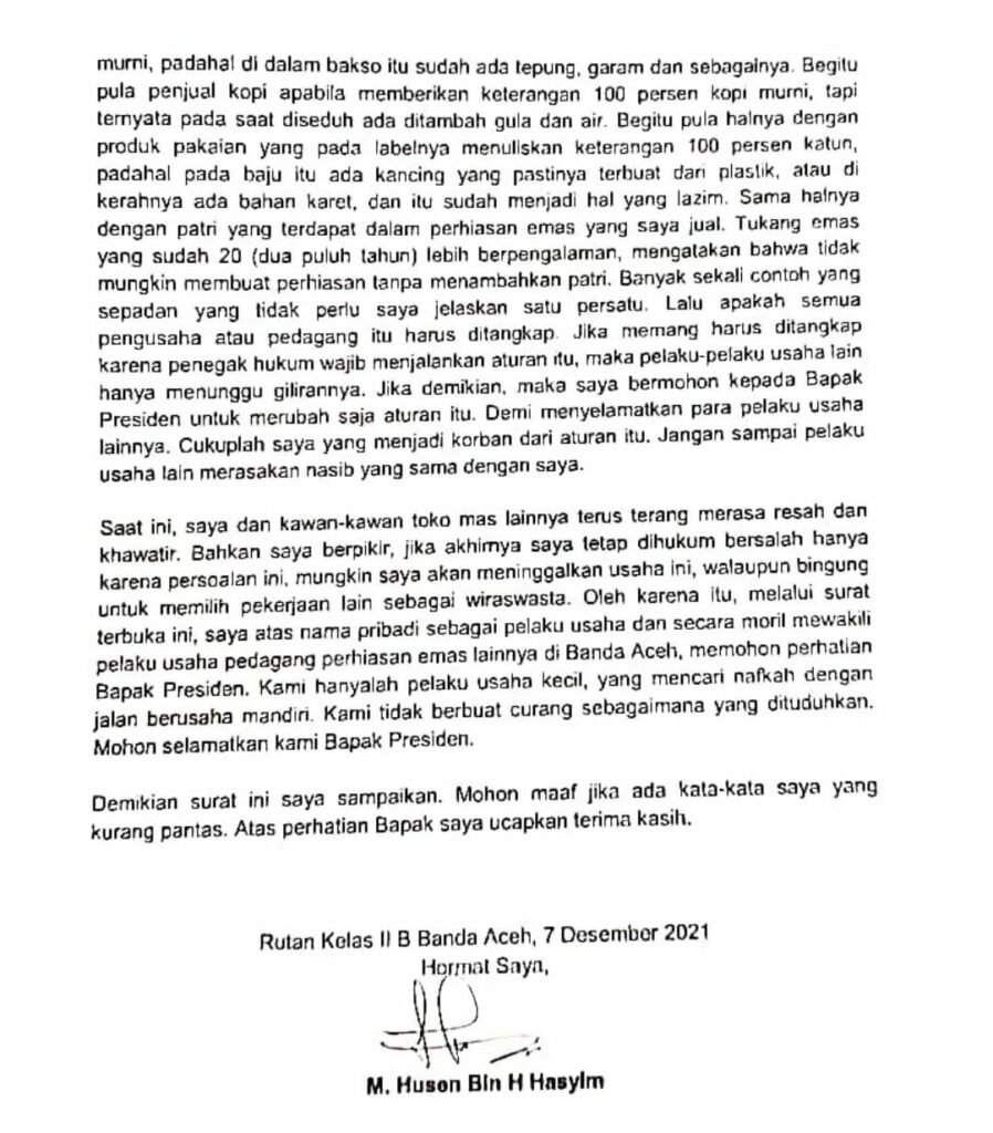 Analisaaceh.com, Banda Aceh — Terdakwa kasus penjualan perhiasan emas tidak sesuai kadar M Husen bin Hasyim menulis surat terbuka untuk Presiden Joko Widodo. Husen meminta perlindungan kepada Presiden Jokowi, karena dia menilai perkara yang menjerat dirinya merupakan ancaman bagi pelaku usaha dan dunia bisnis secara umum.