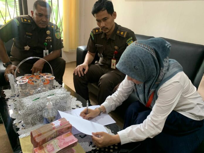 Analisaaceh.com, Banda Aceh | Jaksa Penuntut Umum (JPU) pada Kejaksaan Negeri (Kejari) Banda Aceh menerima uang pengganti dari keluarga terdakwa Ibnu Rusydi bin Burhanudin dalam perkara tindak pidana korupsi dalam pengelolaan keuangan Badan Usaha Milih Gampong (BUMG) Gampong Keuramat Kecamatan Kuta Alam tahun anggaran 2017 dan 2018.