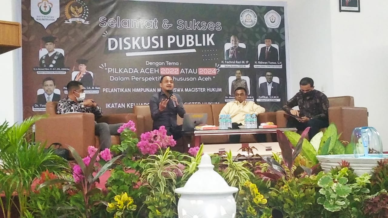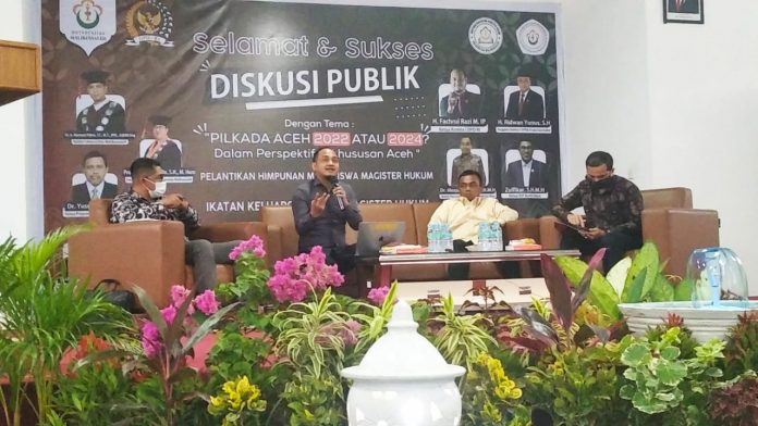 Analisaaceh.com, Lhokseumawe – Ikatan Keluarga Alumni Magister Hukum Universitas Malikussaleh (UNIMAL) menggelar Diskusi Publik dengan Tema ; ” Pilkada Aceh 2022 atau 2024 Dalam Perspektif Kekhususan Aceh “, Sabtu (3/4). Kegiatan Diskusi berbarengan dengan Pelantikan Himpunan Mahasiswa Magister Hukum Periode 2020/2021 bertempat Aula Meurah Silu, Lancang Garam, Kota Lhokseumawe.
