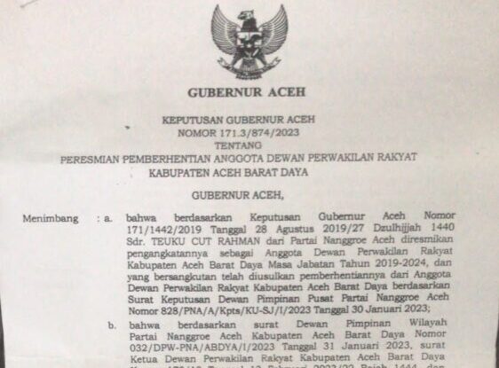 “Dalam surat keputusan Gubernur Aceh itu disebutkan memutuskan meresmikan pemberhentian dengan hotmat saudara Teuku Cut Rahman dari kedudukannya sebagai Anggota DPRK Abdya Masa Jabatan 2019-2024,” ungkap Syarifuddin, Senin (27/3/2023).