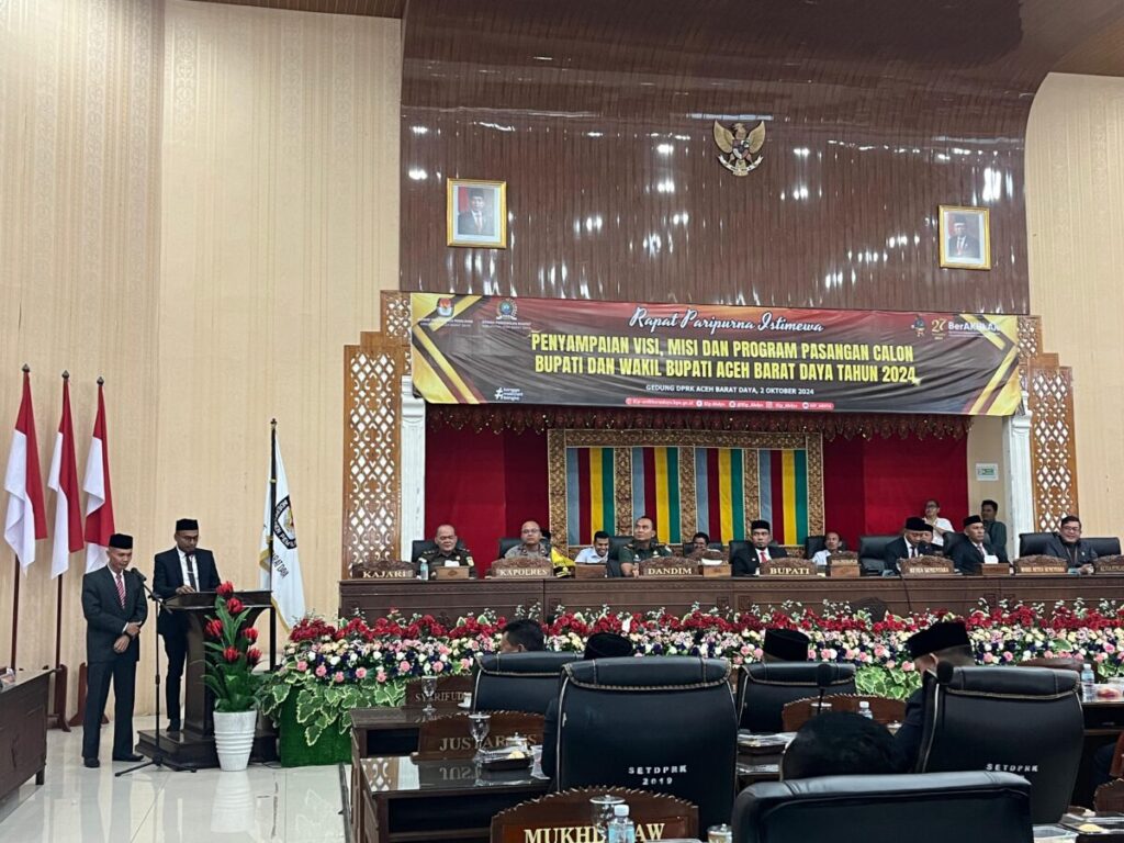 Analisaaceh.com, Blangpidie | Tiga pasangan calon Bupati dan Wakil Bupati Aceh Barat Daya (Abdya) memaparkan visi, misi, dan program kerja dalam rapat paripurna istimewa DPRK Abdya, Rabu (2/10/2024).