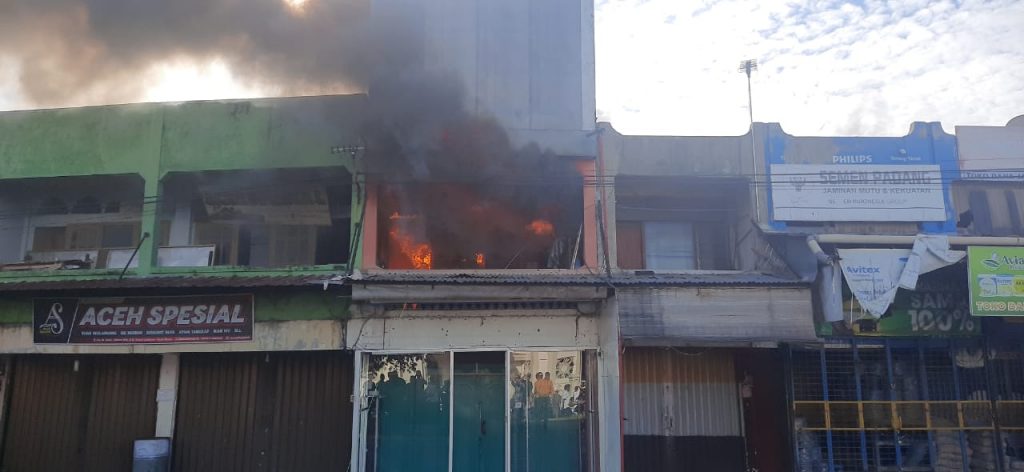 Analisaaceh.com, Jantho | Tiga unit ruko di Jalan Banda Aceh-Medan (depan Mesjid Jamik Lambaro) Kecamatan Ingin Jaya, Aceh Besar terbakar pada Jum’at (23/7/2021).