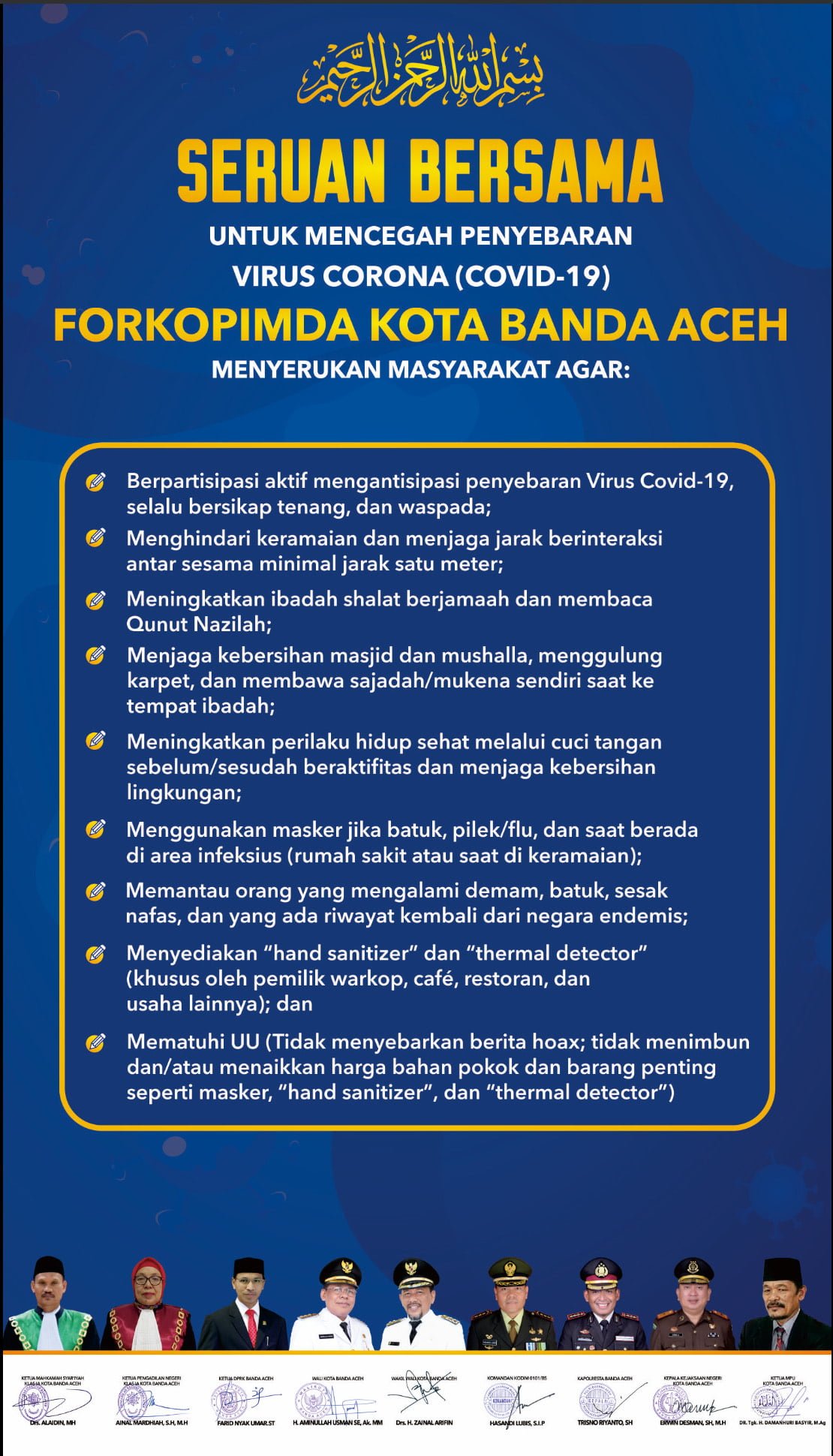 Berikut poin-poin seruan bersama Forkopimda Banda Aceh terkait pencegahan virus Corona:
