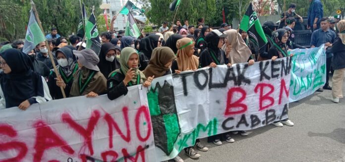 Analisaaceh.com, Banda Aceh | Himpunan Mahasiswa Islam (HMI) se Kota Banda Aceh menggelar aksi unjuk rasa penolakan kenaikan harga Bahan Bakar Minyak (BBM) di Kantor Pertamina Wilayah Aceh, Kamis (8/9/2022).