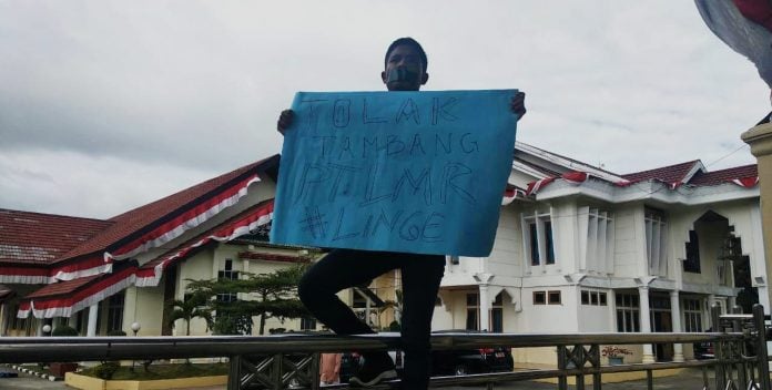 Tak jelas pria itu berasal dari mana, ia membawa kertas karton bertuliskan “Tolak Tambang PT LMR” di akhir tulisan ia membubuhkan tagar “#Linge”.