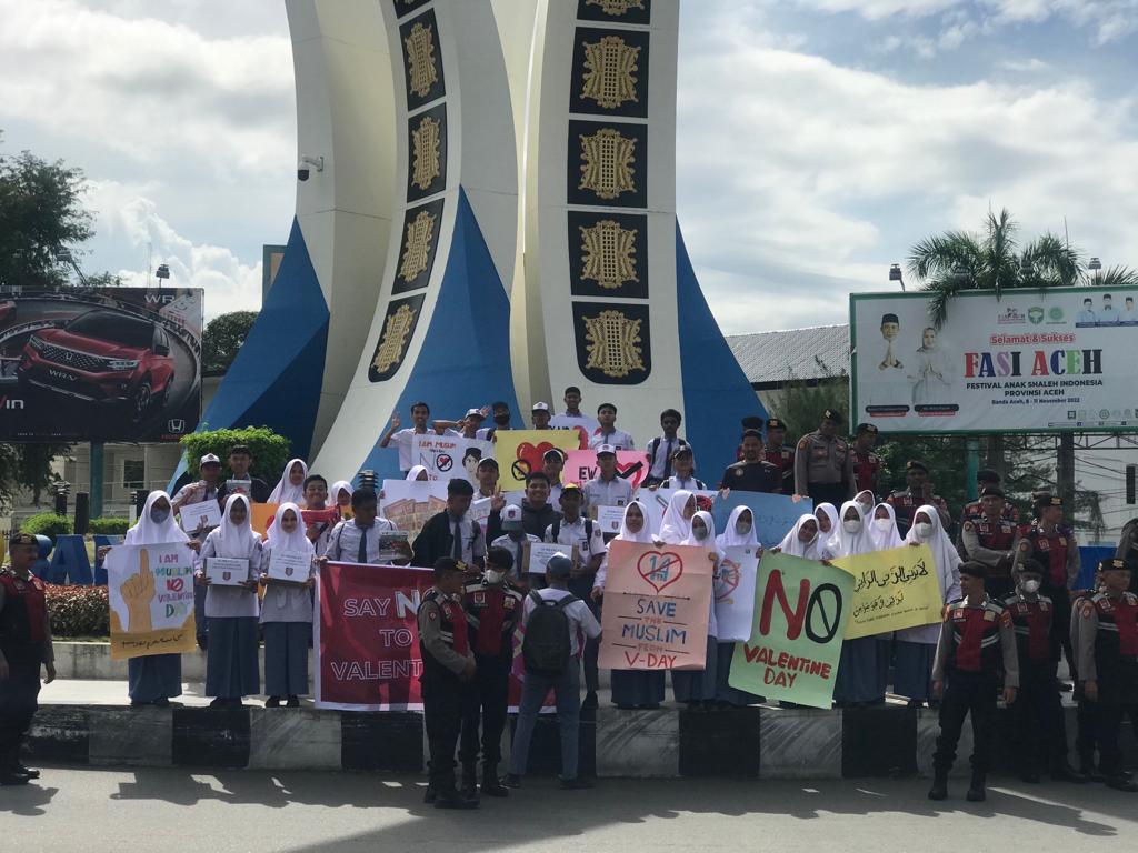 Sejumlah siswa melakukan aksi tolak valentine day di Simpang Lima, Senin (13/2/2023). Foto : Naszadayuna/analisaaceh.com